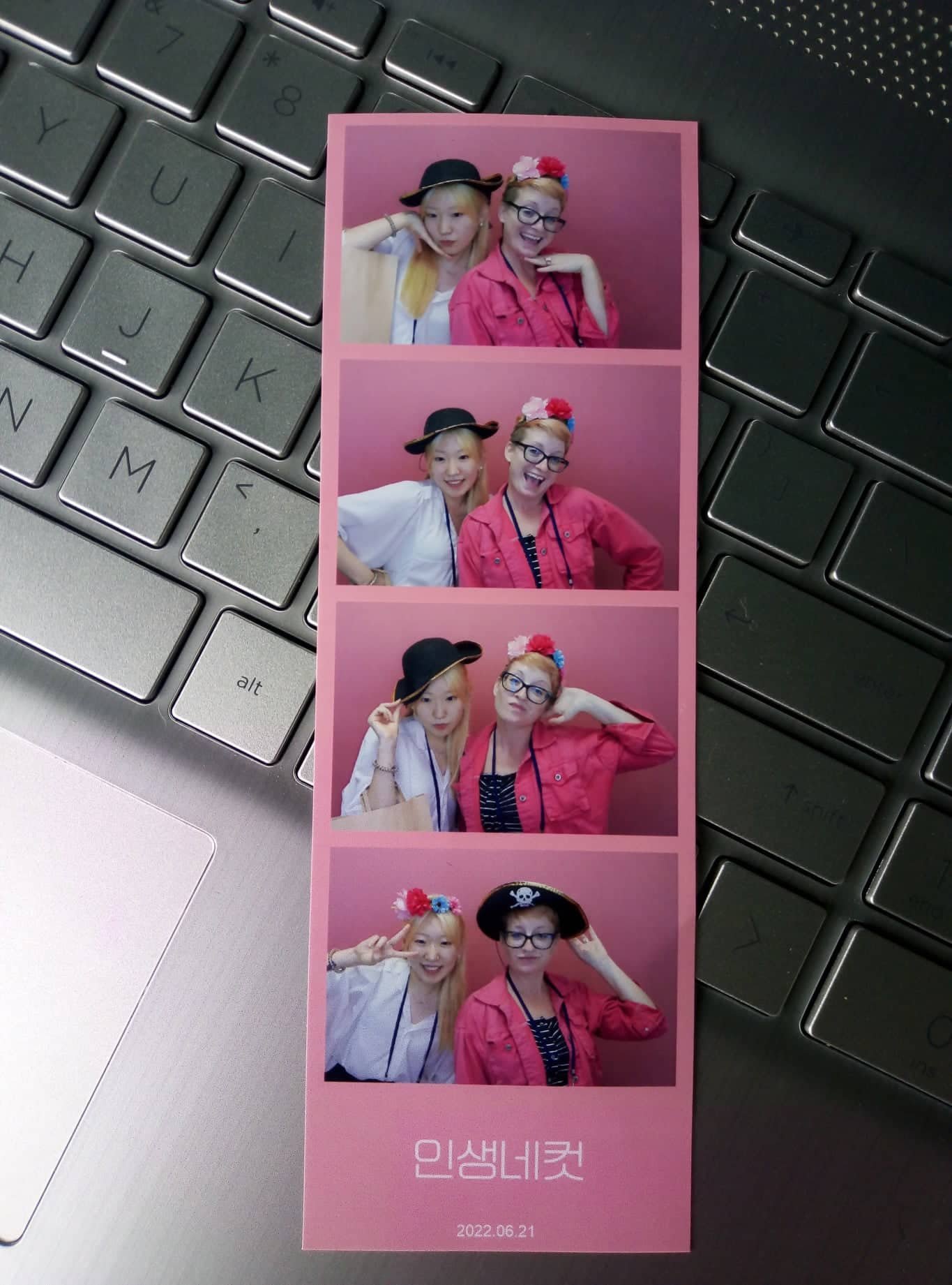 We fell into a great rhythm together, and on a break, we walked down to the mall on a floor below the conference hall. We felt like kids sneaking off to go shopping. She took me into a photo booth, which is quite popular in Korea, and we got some polaroid pictures taken together. It was great fun.
